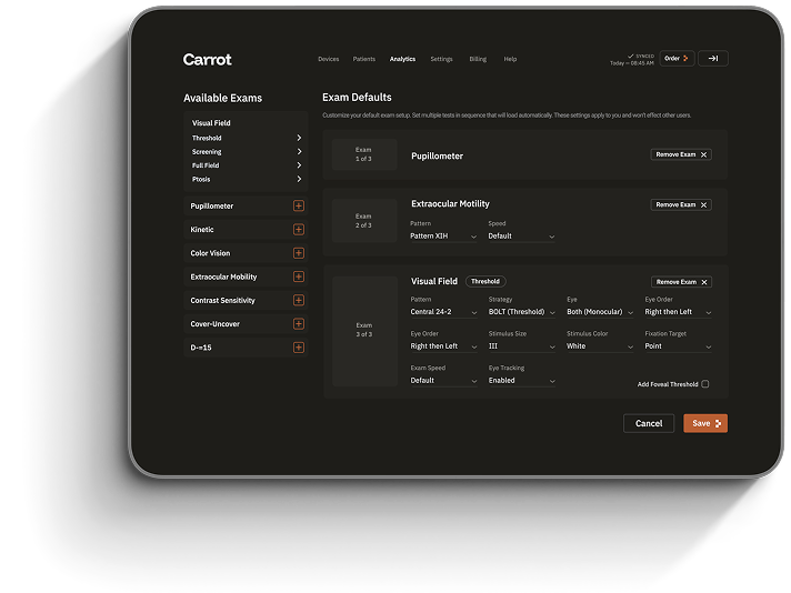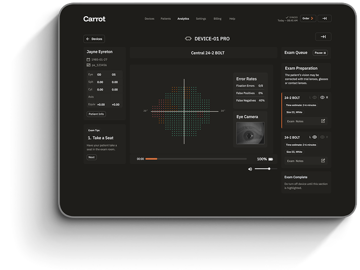 Carrot includes automated quality controls that continuously monitor the integrity of vision and visual field tests. These features include fixation monitoring, reliability checks, and real-time alerts when test quality is at risk, helping ensure accurate results without constant technician intervention.